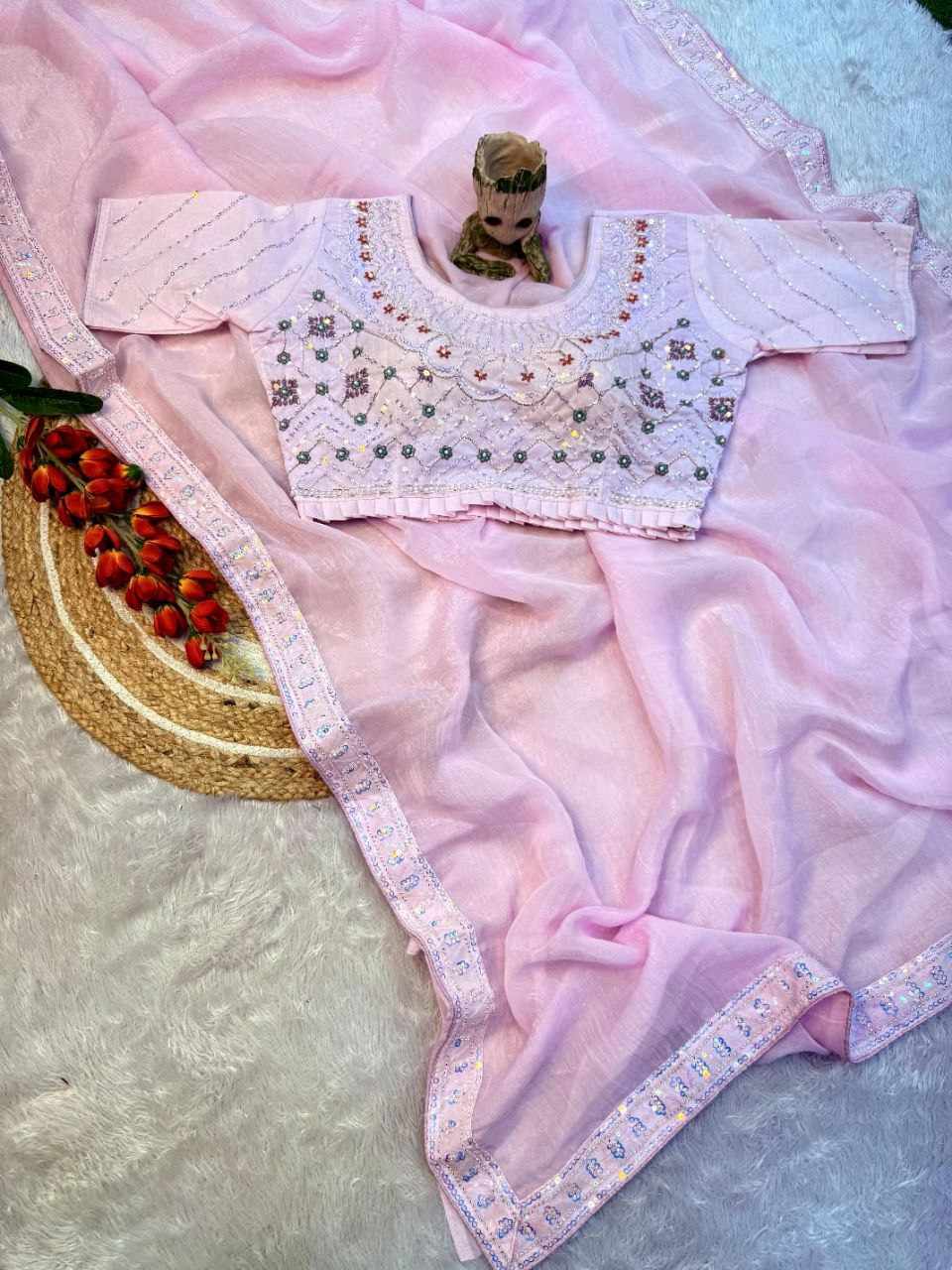Saree Fabric: Beautiful crush shining saree with beautiful heavy handwork with beautiful rainbow sequins attached VALMOTI lace on the saree.