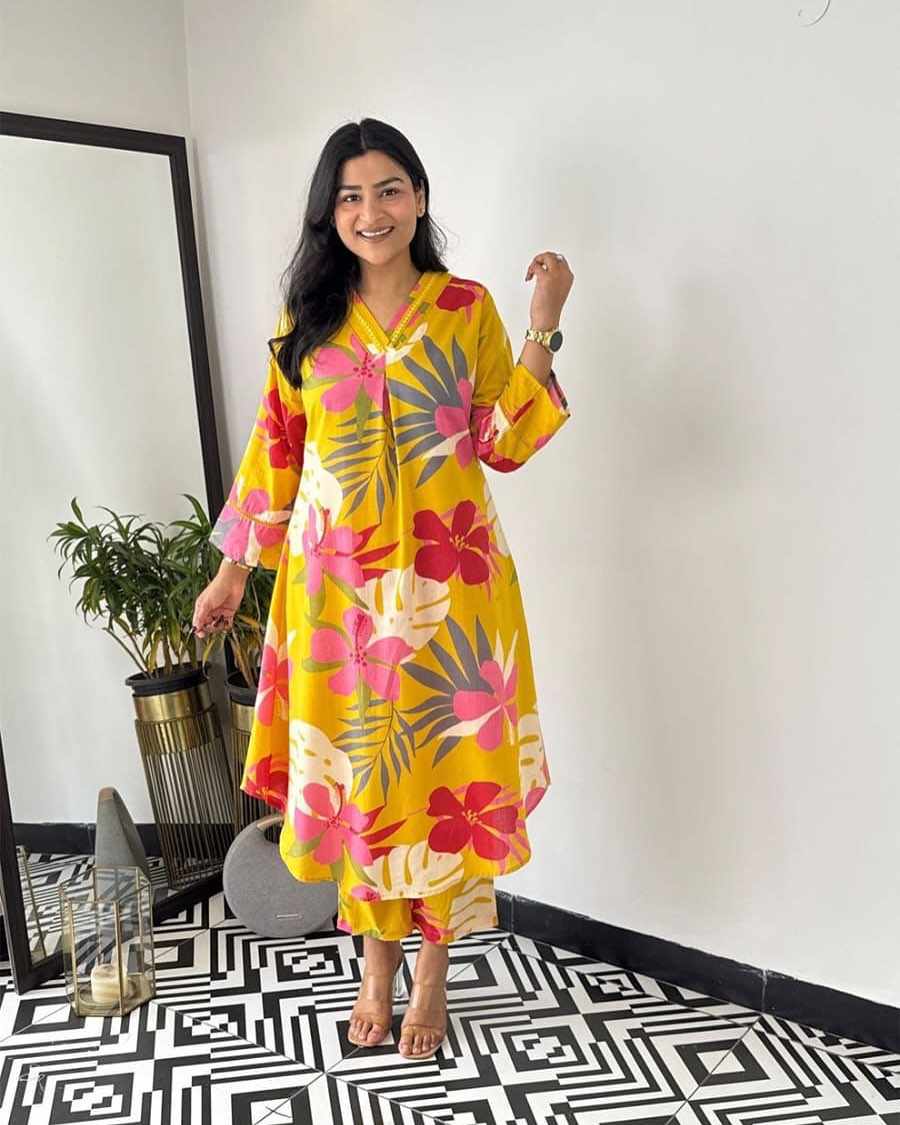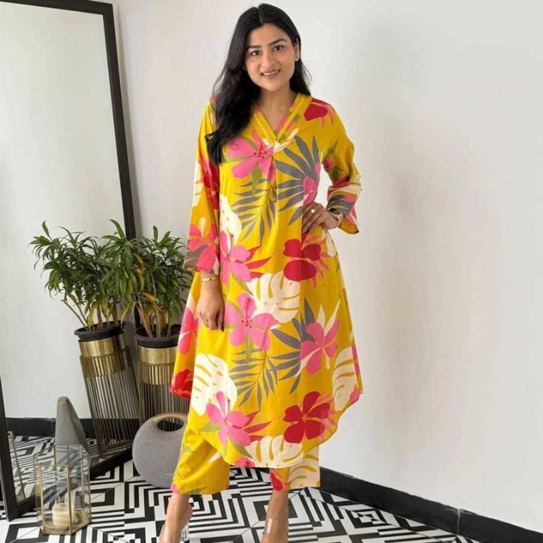 | Name : | SF 2JU Yellow Beautiful Best Cotton Printed Cord Set Dress 717 |